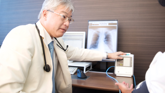 総合外来では、コモンディジーズ(よくある病気)といわれる、一般的な疾患の診療を行います。主には、発熱、のどの痛み、咳、痰、腹痛、下痢や吐き気、血尿、頭痛、めまいなど急性の症状。食事や運動、喫煙や飲酒、ストレスなどが原因となる、高血圧や糖尿病、脂質異常症(高脂血症)などの生活習慣病。気管支喘息や鼻炎などのアレルギー疾患といった、呼吸器系、循環器系、消化器系の疾患に対して検査や治療を行います。